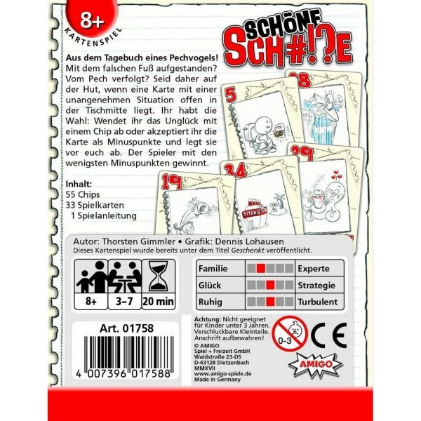 Ziel ist es, möglichst das geringere Missgeschick zu erhalten. Wer an der Reihe ist, muss sich entscheiden: Entweder einen seiner wenigen Chips abgeben, um eine Karte zu vermeiden oder – sie nehmen, um durch Bildung von Kartenreihen das Missgeschick abzuschwächen. Klingt einfach … wenn da nicht immer dieses Risiko wäre. So manch erhaltene Karte bringt einen ganz schön ins Schwitzen.