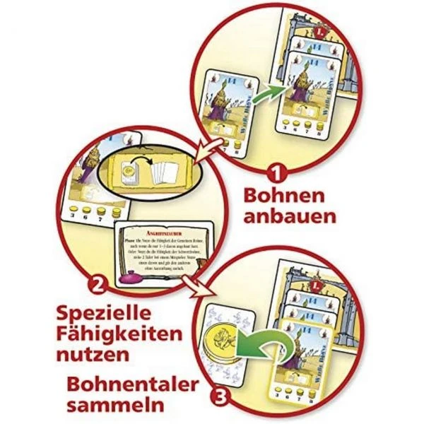 Bohnen anbauen, Taler ernten – und Zauber nutzen! Zauber nutzen? Wählt eure Bohnen auf euren Feldern weise: Jede Sorte hat eine besondere Fähigkeit. Zaubertränke helfen dir, dich gegen deine Mitspieler wirkungsvoller durchzusetzen. Am Ende zählt nur eines: Der beste Bohnenhändler gewinnt!