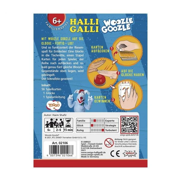 Und so funktioniert der Riesenspaß für Entdecker: Eine Glocke in die Tischmitte, einen Stapel Karten für jeden Spieler, der Reihe nach aufdecken und sobald genau fünf gleiche WoozleGegenstände oben liegen, wird geklingelt. Der Schnellste gewinnt!