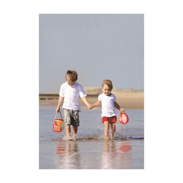 Rotes Sandspielzeug-Set aufklappbar mit Tasche inkl. Schaufel und Förmchen und faltbarem Eimerchen