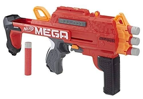 2 Blaster in einem: Der Nerf MEGA Bulldog lässt sich im Handumdrehen vom handlichen Einhand- zum mächtigem Zweihandblaster verwandeln! Einfach den eingeklappten, 2. Griff ausklappen, um automatisch die Schulterstütze zu verlängern und das Visier hochzuklappen – für stabiles Anvisieren der Ziele. Für einen kompakten Blaster einfach den zweiten Griff wieder hochklappen. Der MEGA Bulldog wird mit 3 MEGA-Darts geladen, die nacheinander abgeschossen werden können.