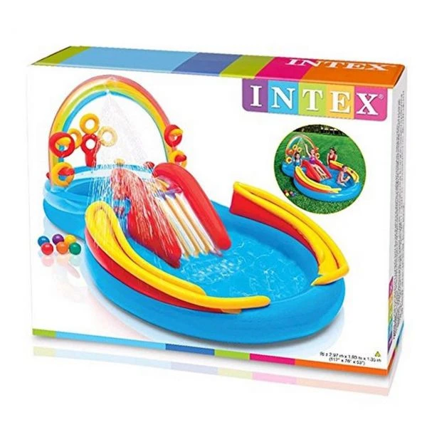 Aufblasbare Spiellandschaft für Kinder mit Rutsche, Wasserspritze, Bällen und Ringe werfen