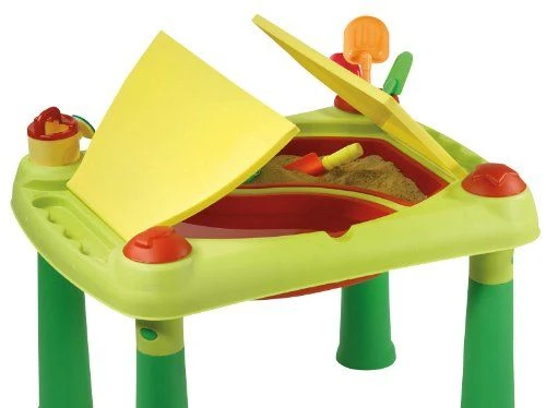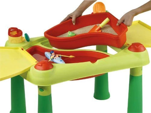 Der Sand-und-Wasser-Spieltisch schärft die Sinne für Sand und Wasser und bietet zahlreiche Spielmöglichkeiten. Die Sand- und Wasserbehälter lassen sich zum einfachen Auffüllen und Reinigen herausnehmen. Dank des haltbaren Kunststoffmaterials ist der Tisch sehr pflegeleicht. Kinder lieben das enthaltene Zubehör und die große Spielfläche der beiden Schutzdeckel.