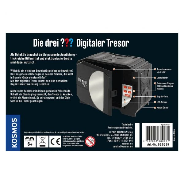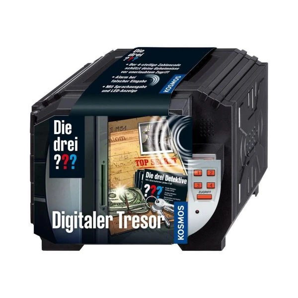 Nicht nur die drei Detektive aus Rocky Beach, Justus Jonas, Peter Shaw und Bob Andrews, brauchen einen sicheren Aufbewahrungsort für geheime Dokumente, wichitge Indizien und gesicherte Beweise. Auch Nachwuchs-Detektive ab acht Jahren müssen vertrauliche Dinge vor unbefugtem Zugriff schützen! Im Digitalen Tresor sind alle Geheimnisse sicher, denn er kann nur mit einem selbst einstellbaren, vierstelligen Code geöffnet werden. Wenn Diebe am Werk sind ertönt ein Alarm, der den Besitzer auf den Plan ruft. So kann der Einbrecher schnell gefasst werden – Fall gelöst!