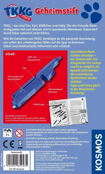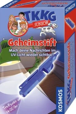 Unsichtbare Botschaften schreiben, die nur von ganz bestimmten Leuten gelesen werden sollen? Mit dem TKKG Junior Geheimstift ist das kein Problem! Geheime Nachrichten ganz einfach mit dem Spezialstift schreiben und mit der abnehmbaren UV-Lampe wieder sichtbar machen. So können kleine Detektive wie TKKG Junior geheime Informationen hinterlassen, die bei der Auflösung des Falles weiterhelfen!
