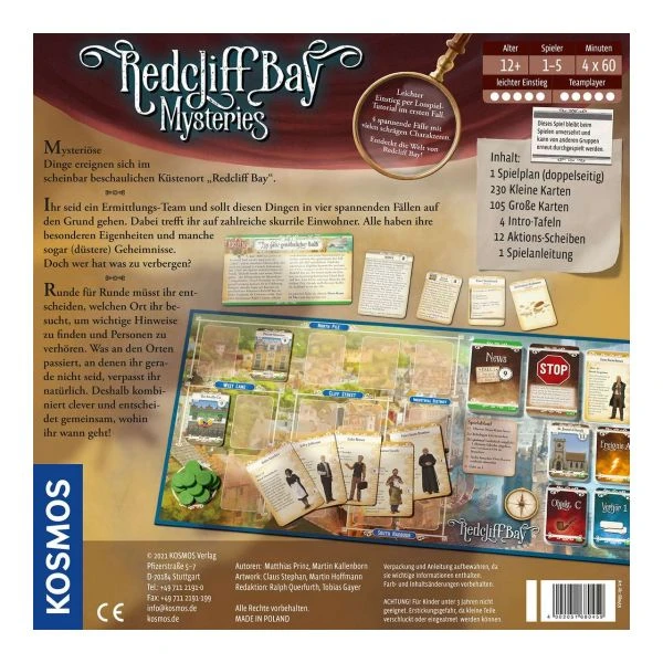 Seltsames geht hier vor! Ein Team nimmt im verträumten Küstenort Redcliff Bay die Ermittlungen in vier Fällen auf. Das ist gar nicht so einfach: Bei der Suche nach Spuren treffen die 1-5 Spieler und Spielerinnen nämlich auf sehr eigenwillige Einwohner mit speziellen Eigenheiten. Verdächtig, oder? Runde für Runde entscheidet das Team, an welchem Ort es zur aktuellen Uhrzeit in diesem Krimi weiterermittelt. Gemeinsam wägt das Team ab, wo es gerade wohl die nützlichsten Informationen gibt oder die interessantesten Dinge vor sich gehen. Eine spannende Geschichte, einfache Regeln und schräge Charaktere – das ideale Detektiv-Spiel für Familien.
