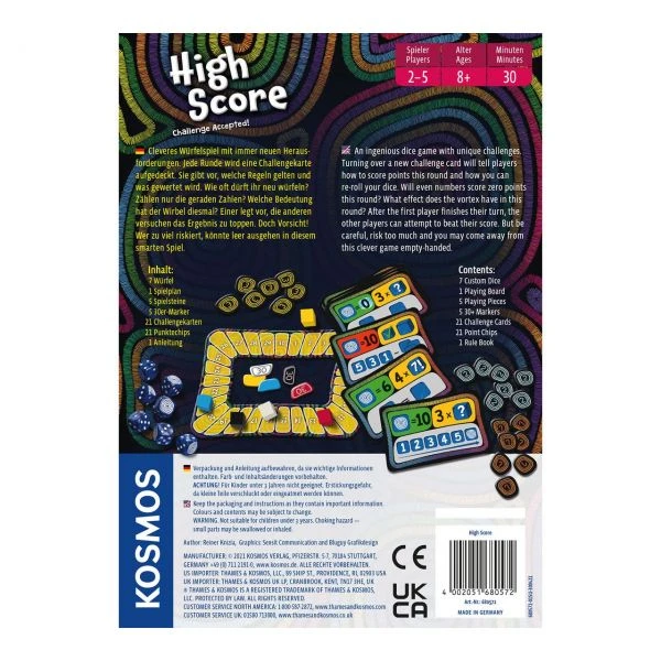 Inhalt: 1 Spielplan, 5 Spielsteine, 5 30er-Marker, 7 Würfel, 21 Challengekarten, 21 Punktechips (Gold, Silber, Bronze), 1 Spielregel