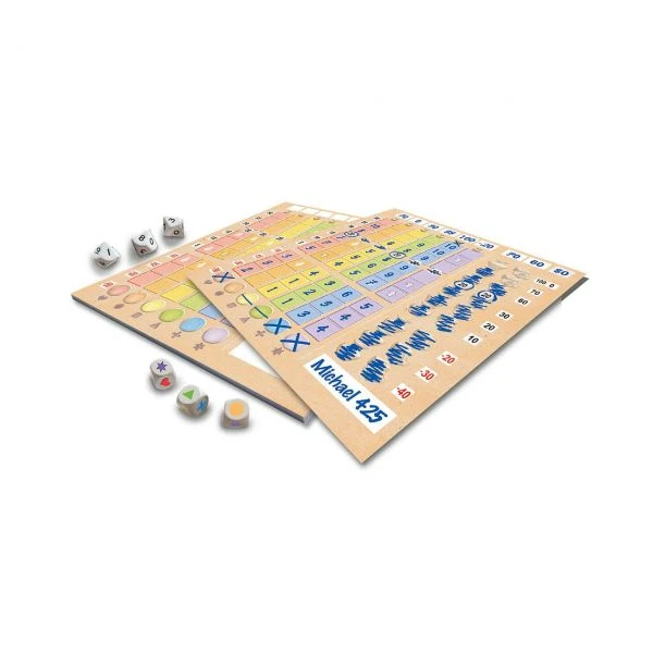 Inhalt: Spielblock, 3 Farbwürfel mit Symbolen, 3 Zahlenwürfel