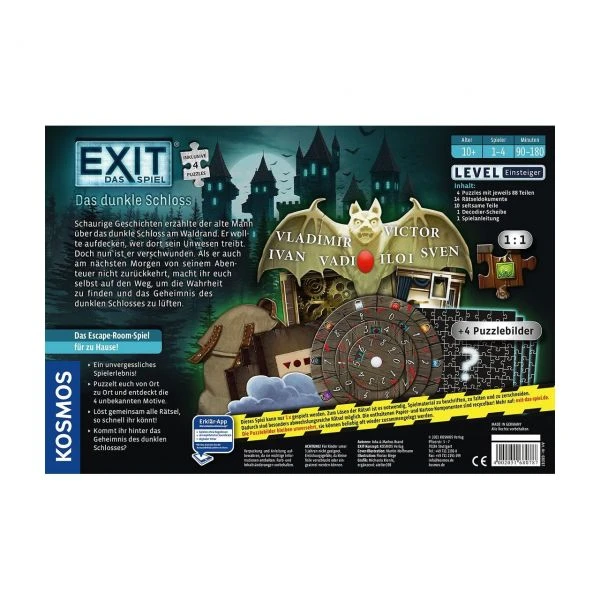 Die Spieler müssen dem Entführten schnell zur Hilfe eilen! Dafür lesen sie die Abenteuergeschichte und setzen nacheinander vier Puzzles zusammen, die sie an einsame Orte und in schaurige Räume führen. Sie bestehen gemeinsam Gefahren und lösen clevere und überraschende Rätsel. Bei diesem Escape Room Spiel hilft das ganze Team mit!