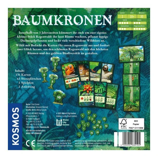 Inhalt: 176 Karten, 3 Baum-Plättchen, 1 Wald-Plättchen, 39 Blatt-Chips, 1 Spielplan, 1 Spielanleitung