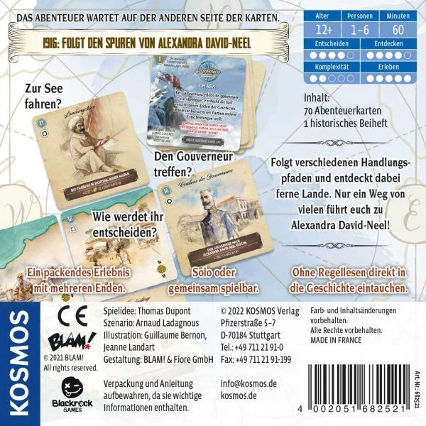 Tibet, 1916: Auf den Spuren der Journalistin Alexandra David-Néel geraten die 1-6 Spielerinnen und Spieler in ein aufregendes Abenteuer. Es geht über Ceylon und Indien bis nach Tibet hinein ins Ungewisse. Die beiden Regelkarten führen in diesem Abenteuerspiel ins Geschehen ein, danach wird sofort losgespielt. Auf einigen Karten sind Orte zu sehen, andere stellen das Team vor Entscheidungen, die auf andere Karten verweisen und den weiteren Verlauf des Spieles beeinflussen. Karte für Karte entwickelt sich die Geschichte. Wie wird sie ausgehen? Die Spielerinnen und Spieler entscheiden in diesem Abenteuerspiel gemeinsam den Verlauf der Geschichte. Auf ins Abenteuer!