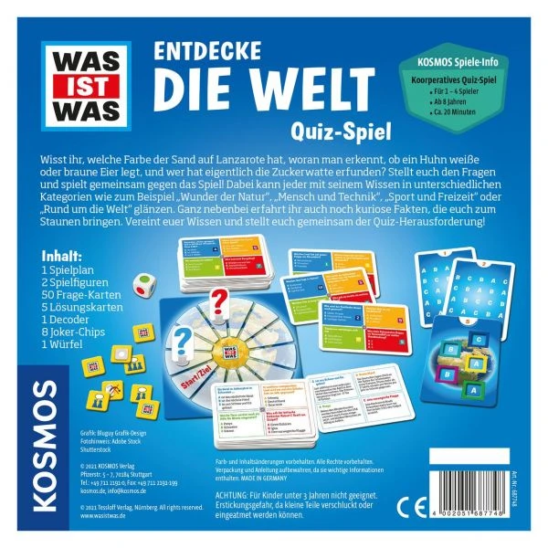 Wie sieht der Sand auf Lanzarote aus? Wer hat Zuckerwatte erfunden? Diesen und unzähligen weiteren Fragen aus fünf Kategorien gehen Kinder ab 8 Jahren gemeinsam im kooperativen Brettspiel nach. Tiere und Pflanzen, Geschichte, Technik, Wissenschaft und kluge Köpfe: der Würfel entscheidet, welcher Themenbereich zuerst drankommt. Frage richtig beantwortet? Die Decodierkarte hilft, die passenden Lösungen und Infos zu finden. Die Spielfigur darf weiterwandern. Und wenn die Frage doch zu schwierig ist? Dann helfen unterschiedliche Joker-Chips. Ein tolles Quiz und Familienspiel mit Lerneffekt für Groß und Klein! Das ideale Geburtstagsgeschenk.