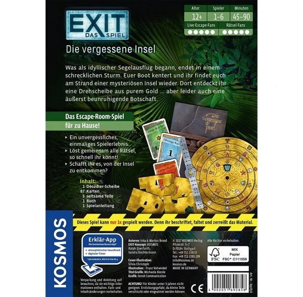 Bei „EXIT – Das Spiel“ entdecken die Spieler mit etwas Kombinationsgabe, Teamgeist und Kreativität nach und nach immer mehr Gegenstände, knacken Codes, lösen Rätsel und kommen der Freiheit Stück für Stück näher. Dabei müssen auch ungewöhnliche Wege beschritten werden. So darf das Material geknickt, beschriftet oder zerrissen werden. Ist das Geheimnis der Insel einmal gelüftet, kann das Event-Spiel kein zweites Mal gespielt werden. Das macht den Spieleabend zu einem besonderen Highlight. Live-Escape-Feeling im Fortgeschrittenen-Level.