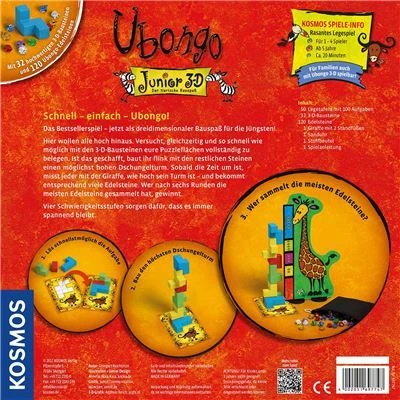 Einfach – tierisch – Ubongo 3-D! Dreidimensionaler Bauspaß für die Jüngsten. Gleichzeitig und so schnell wie möglich legen die Spieler ihre Bausteine auf die Grundfläche. Dabei darf kein Kästchen frei bleiben und nichts über den Rand hinausragen. Ist das geschafft, bauen die Spieler flink mit den restlichen Steinen einen möglichst hohen Ubongo Dschungelturm. Nach 90 Sekunden ist die Zeit um. Nun kontrolliert jeder der Reihe nach, ob die Grundfläche richtig belegt ist und misst dann mit der Giraffe die Höhe des eigenen Turms. Je höher der Turm, desto mehr Edelsteine gibt es dafür. Wer am Ende die meisten Edelsteine besitzt, gewinnt diesen tierischen Bauspaß! Vier Schwierigkeitsstufen sorgen für reichlich Abwechslung und Spannung – auch in gemischten Altersgruppen! Ganz nebenbei wird das logische Denkvermögen spielerisch gefördert. Kombinierbar mit „Ubongo 3-D“