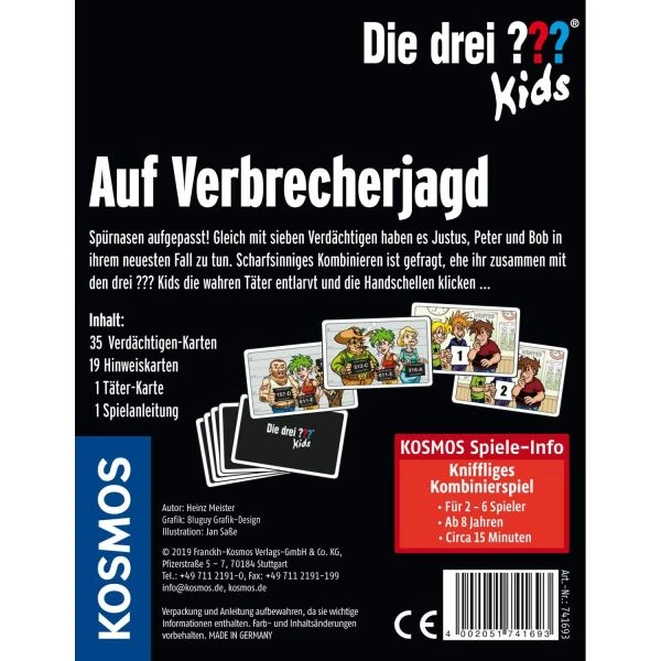 Bahn frei für alle Nachwuchs-Detektive! Dieses spannende Kartenspiel erfordert Köpfchen und Teamwork. Gleich mit sieben Verdächtigen haben es Justus, Peter und Bob in ihrem neuesten Fall „Auf Verbrecherjagd“ zu tun. Scharfsinniges Kombinieren ist gefragt, ehe die Spieler zusammen mit den drei ??? Kids die Täter entlarven und die Handschellen klicken …
