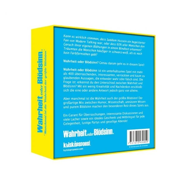 Wahrheit oder Blödsinn ist ein unterhaltsames Spiel mit mehr als 400 überraschenden, interessanten, verrückten und kaum zu glaubenden Aussagen, die entweder wahr oder falsch sind. Die Frage ist: erkennst du den Unterschied zwischen Wahrheit und Blödsinn?