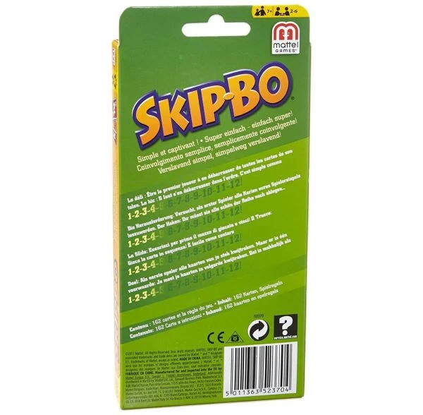 Beim beliebten Skip-Bo Kartenspiel ist strategische Vorgehensweise unerlässlich. Ziel des Spiels ist es, als erster Spieler die Karten seines Spielerstapels in der Reihenfolge 1 – 12 abzulegen. Diese spannende Patience-Variante bietet Unterhaltung für die ganze Familie. 2 – 6 Spieler, ab 7 Jahren.