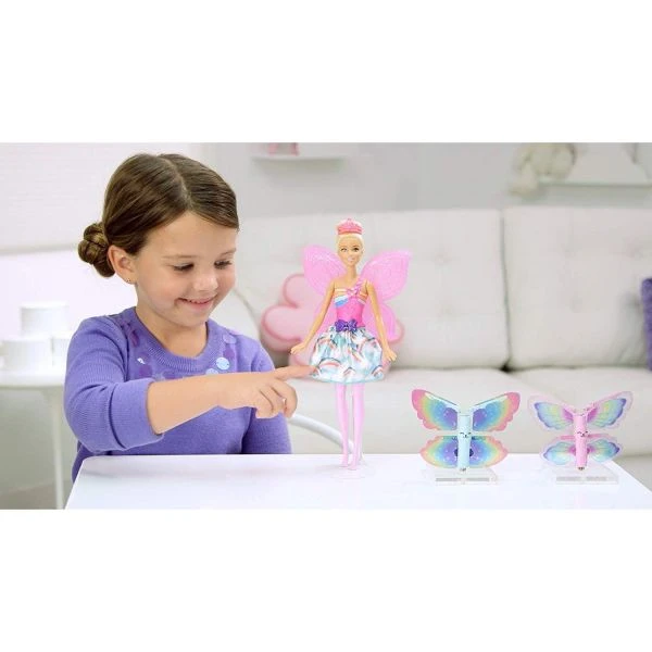 Mit der „Barbie Dreamtopia Magische Flügel-Fee“-Puppe können Kinder ihrer Fantasie freien Lauf lassen – sie hat Flügel, die wirklich fliegen! So entsteht ein magischer Moment, der für viele Spielspaß sorgt. Einfach ein der zwei enthaltenen Paar Flügel an den Schmetterlingsflügeln am Rücken der Barbie Flügel-Fee anbringen. Sie rasten ein, sodass Barbie mit einem doppelten Paar Flügel wunderschön aussieht. Dann viermal an der lilafarbenen Schleife an der Taille von Barbie ziehen. Wenn der auf ihrem Oberteil versteckte Schmetterlingsknopf gedrückt wird, geht es los und die Flügel setzen sich in Bewegung und heben in die Luft ab! Die hinreißenden flatternden Bewegungen und farbenfrohen Designs lassen die Flügel wie magische Schmetterlinge aussehen! Es macht so viel Spaß, immer und immer wieder aufs Neue loszufliegen, insbesondere da zwei Paar Flügel im Set enthalten sind. Kinder werden sich mit Begeisterung Geschichten ausdenken, die ihre Fantasie beflügeln. Die Barbie Flügel-Fee trägt ein „Dreamtopia Regenbogen-Königreich“-Outfit und ist bereit, alle Träume zu verwirklichen. Ihr pinkfarbenes Oberteil ist mit Regenbogenstreifen und Sternen verziert und ihr Feenrock ist mit schimmernden Wolken und Regenbögen bedruckt. Ein pinkfarbenes Diadem verleiht dem Ganzen einen königlichen Akzent für ausgefallene Feenanlässe. Mit diesen Sets sind kindlichen Spielideen keine Grenzen gesetzt, denn Dreamtopia ist eine Welt, in der Träume wahr werden. Zusammen mit den Schwestern Barbie und Chelsea können Kinder Szenen aus Zeichentrickserien nachspielen, sich märchenhafte Geschichten ausdenken und kreative Spiele zum Leben erwecken. Enthält eine „Barbie Flügel-Fee“-Puppe mit Diadem und zwei Paar Flügeln. Die Puppe kann nicht von allein stehen. Abweichungen in Farbe und Gestaltung vorbehalten.