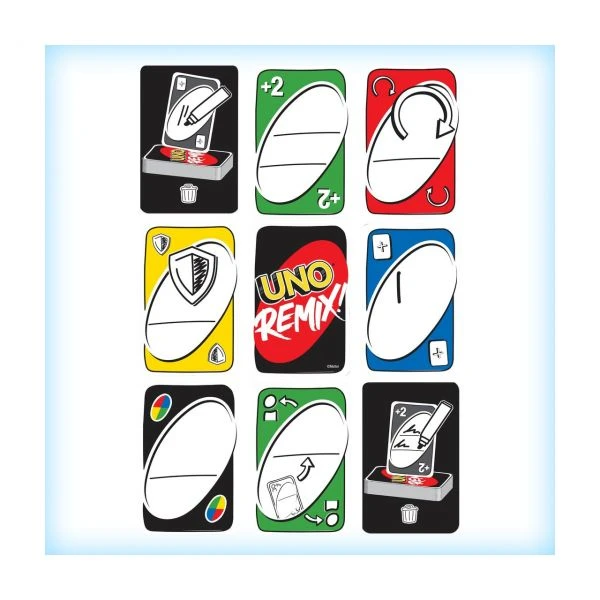 UNO Remix gibt den Spielern die Möglichkeit, ein UNO-Kartenspiel individuell zu gestalten, das sich mit jeder Runde weiter entwickeltZu Beginn jeder Runde fügen die Spieler beschriftbare Spezialkarten hinzu, die in den Spielverlauf eingreifen. So können Karten auf einzelne Spieler zugeschnitten werden (z. B. „Weiter mit Jeff“ oder „2 Ziehen für Maria“), andere erhöhen die Anzahl der Karten, die der nächste Spieler ziehen muss, blockieren Sonderkarten und vieles mehr! Gruppen können so ihr ganz eigenes Kartenspiel schaffen. Eines jedoch bleibt: Sobald ein Spieler nur noch eine Karte hat, wird „UNO!“ gerufen. Abweichungen in Farbe und Gestaltung vorbehalten.