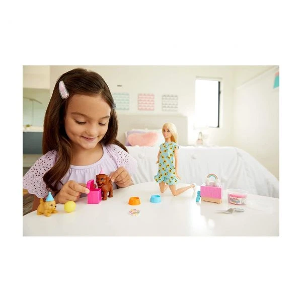 Jedes Hündchen bekommt einen Partyhut, und dann gibt Barbie Knet-„Teig“ in einer oder zwei Farben in die Kuchenform. Der Hebel lässt den niedlichen Kuchen in Knochenform „aufgehen“! Anschließend wird der Kuchen dekoriert und Barbies Haustieren in den bunten Hundenäpfen serviert. In der Geschenkschachtel steckt ein Ball für die Hündchen, und das größere Hündchen kann „kauen“, wenn der Schwanz bewegt wird. Die Puppe kann nicht von allein stehen. Abweichungen in Farbe und Gestaltung vorbehalten.