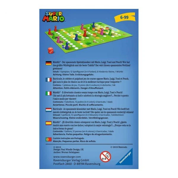 Beim Super Mario Malefiz® versuchen die Spieler ihre Spielfiguren am schnellsten ins Ziel zu bringen. Dazu ist vor allem Würfelglück gefragt. Wer die richtigen Zahlen würfelt, kann Hindernisse aus dem Weg räumen und sie den Mitspielern vor die Nase setzen! Mit Mario, Luigi, Peach und Toad bekommt der Ravensburger Spieleklassiker einen ganz neuen Look.