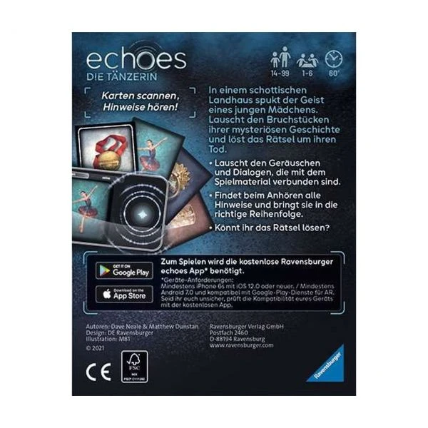 Die Spieler hören mithilfe der kostenlosen Ravensburger echoes App mysteriöse Geräusche und Stimmen, die mit den Kartenmotiven verbunden sind. Gemeinsam bringen sie die 24 Teile der Geschichte in die richtige Reihenfolge, um den Fall zu lösen.