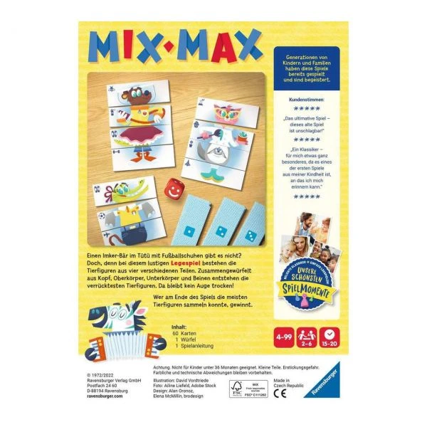 Im verrückten Tier-Legespiel Mix Max geht es in zwei Spielvarianten darum, mit ein wenig Würfelglück die lustigsten Kombinationen oder richtig zueinander passende Karten zu sammeln