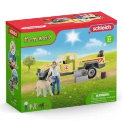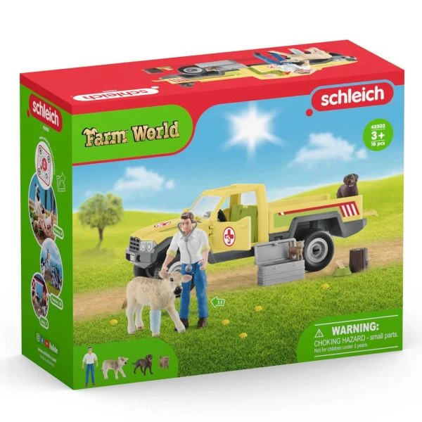 Inhalt: 1x Pick-Up, 1x Tierarzt, 1x Kälbchen, 1x Labrador Retriever Hündin, 1x Kätzchen, 1x Alukiste, 1x Stethoskop, 1x Bandage, 1x Napf, 1x Knochen, 1x Baumstamm, 1x Stickerbogen