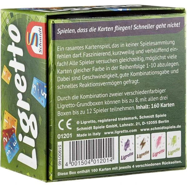 Ihr wollt „Ligretto“ gerne auch mal zu fünft, sechst oder gar zu zwölft spielen? Kein Problem! Dann holt euch doch einfach noch die andersfarbigen Ligretto-Schachteln. Es gibt Ligretto in rot, blau und grün – jede Schachtel für jeweils 4 Spieler (3 Schachteln = 12 Spieler)!
