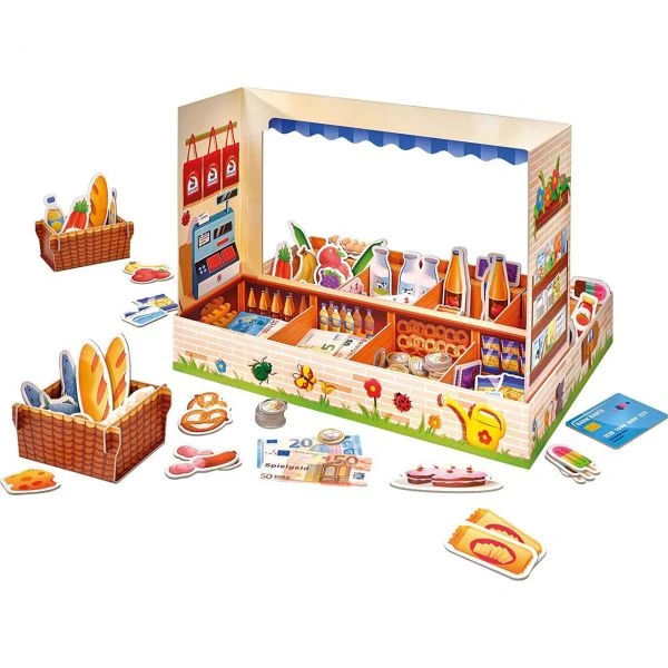 Das so beliebte Spielethema Kaufladen gibt es jetzt neu im handlichen Tischformat. Der Aufbau ist kinderleicht und folgt dabei dem bewährten Prinzip des Klassikers Kinderpost. Die Waren-Plättchen und Münzen bestehen aus fester Pappe, die schönen Scheine aus bedrucktem Papier. Wer will noch mal, wer hat noch nicht? Der Kaufmannsladen lädt ein zum Rollenspiel rund ums Ein- und Verkaufen.