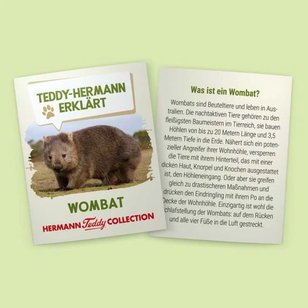 Ein solches besondere Spielzeug ist der weiche und niedliche Wombat aus der Serie für kleine Naturforscher von Teddy Hermann. Das Kuscheltier wurde aus hochwertigem Material produziert, was für alle Eltern wichtig ist, und hat ein erstaunliches Design, um die Aufmerksamkeit der Kinder auf sich zu ziehen. Der flauschige Wombat von Teddy Hermann hat eine kompakte Form, braunes weiches Fell, zwei Knopfaugen, kleine süße Öhrchen und ein kleines Infoheft mit seiner Geschichte.