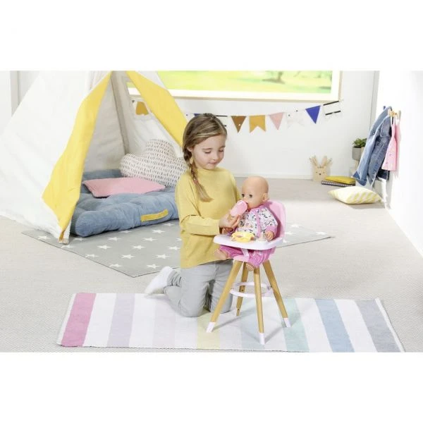 Im praktische Hochstuhl kannst du BABY born ganz einfach füttern. Der Stuhl im skandinavischen Design hat Beine in Holz-Optik und einen bequemen pinken Sitz. Bär Bruno und Ente Berta warten auf der Rückenlehne auch schon gespannt aufs Essen. Auf dem hellrosa Tischchen haben BABY borns Breiteller und ihre Flasche Platz. Und natürlich ist das Tischchen nicht nur zum Essen da. Hier darf auch gemalt, gebastelt und mit Bauklötzen gespielt werden.
