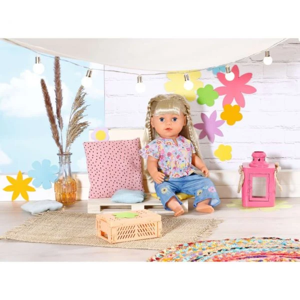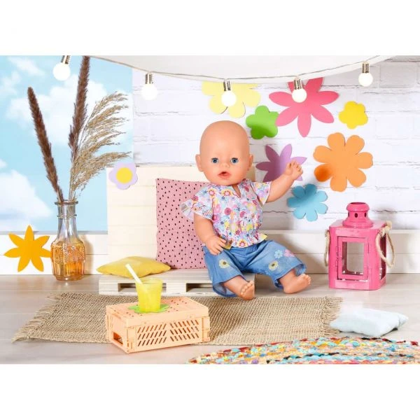 Mit dem Camper-Van die schönsten Plätze der Erde besuchen, abends am Lagerfeuer Gitarre spielen…BABY born hat ein hipp(i)es Outfit für solche Ausflüge. Die Bluse ist über und über mit Blumen bedruckt. Sie hat wallende Ärmel und eine verspielte Raffung am unteren Bund. Dazu trägt das kleine Blumenkind eine Schlaghose in Jeansoptik mit aufgesetzten Taschen. Sie ist mit einem bezaubernden Schmetterling und weiteren Blumen bedruckt. Flower Power all over.